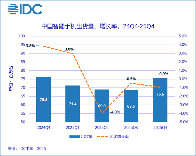1月20日,国际数据公司(IDC)发布最新手机季度跟踪报告,数据显示,2025年第四季度,中国智能手机市场出货量约7,564万台,同比微降0.9%,市场表现平稳;2025年全年,中国智能手机市场出货量约2.84亿台,同比下降0.6%。