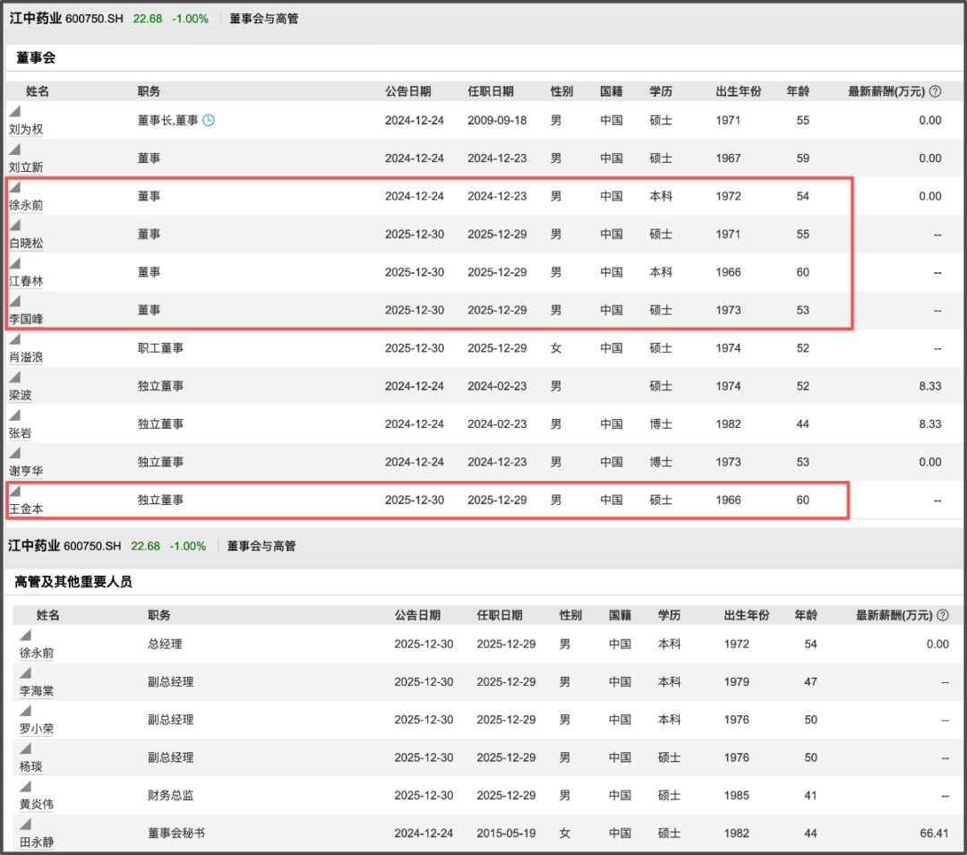 ▲江中药业现任董事及高管团队成员,来源:Wind金融终端
