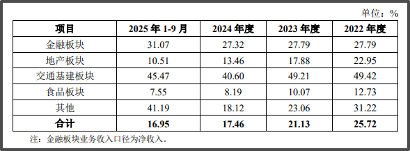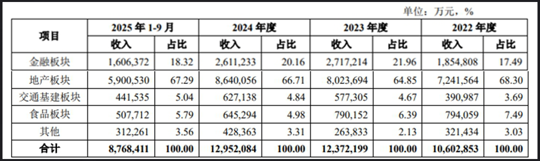 据《星岛》查询,2022—2024年,越秀集团整体营收稳步增长,从1060.29亿元增至1295.21亿元,年复合增长率10.53%,2025年前三季度也录得876.84亿元。而分业务看,近三年及一期,食品板块合计营收分别只有79.41亿元、79.02亿元、64.53亿元及50.77亿元,对应收入占比仅7.49%、6.39%、4.98%及5.79%,始终排在金融、地产板块之后,且占比呈现波动下滑趋势。