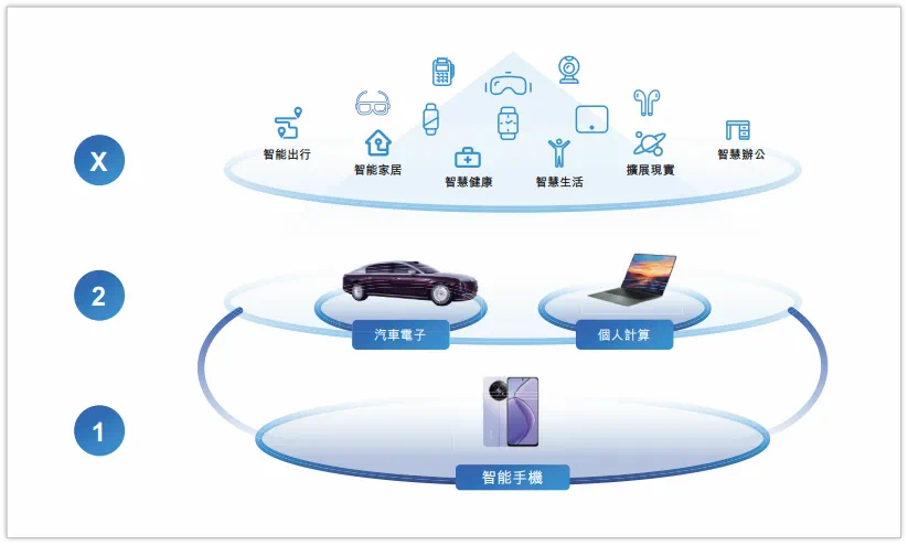 除核心的智能手机ODM业务外,龙旗科技已构建“1+2+X”产品战略布局:以智能手机为核心业务,将AI、PC、汽车电子作为重点发展业务,同时积极拓展智能穿戴(智能手表/手环)、智能眼镜等新兴业务。