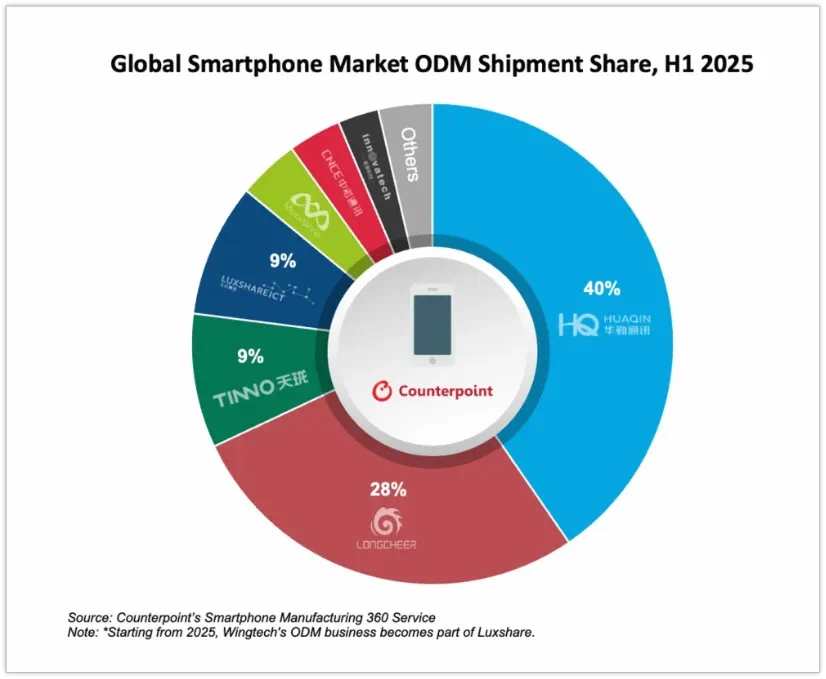 根据Counterpoint Research发布的报告,2025年上半年,ODM设计的智能手机出货量占全球总出货量的43%。其中,龙旗科技以28%的份额位列全球手机ODM市场第二,仅次于华勤技术。