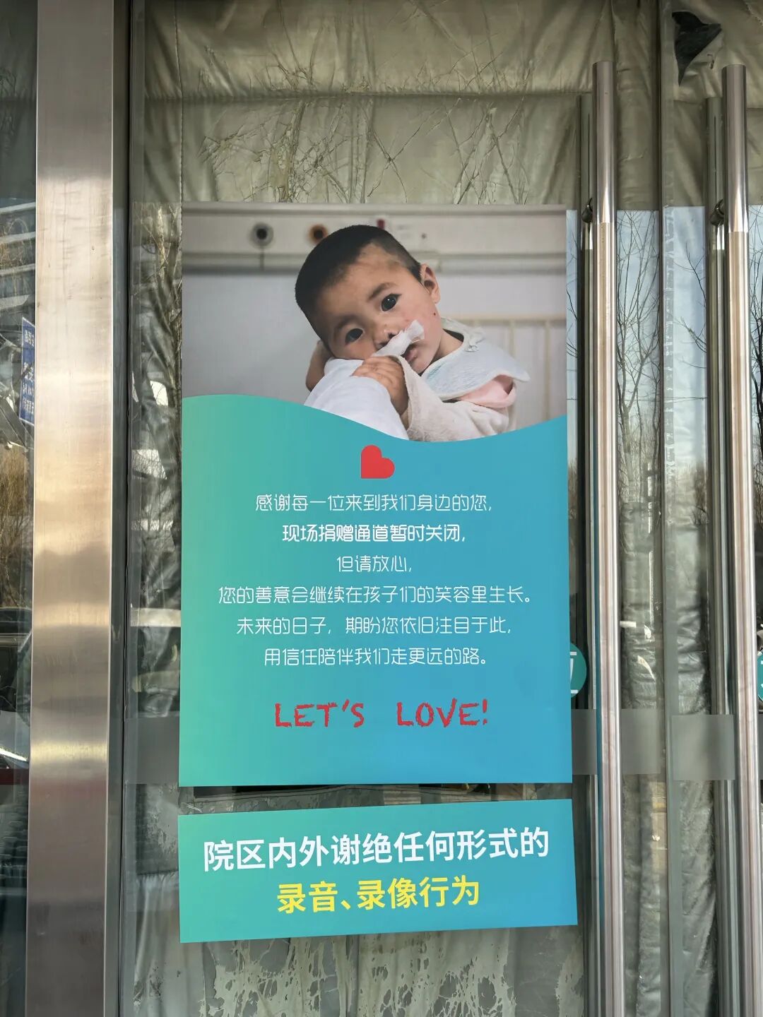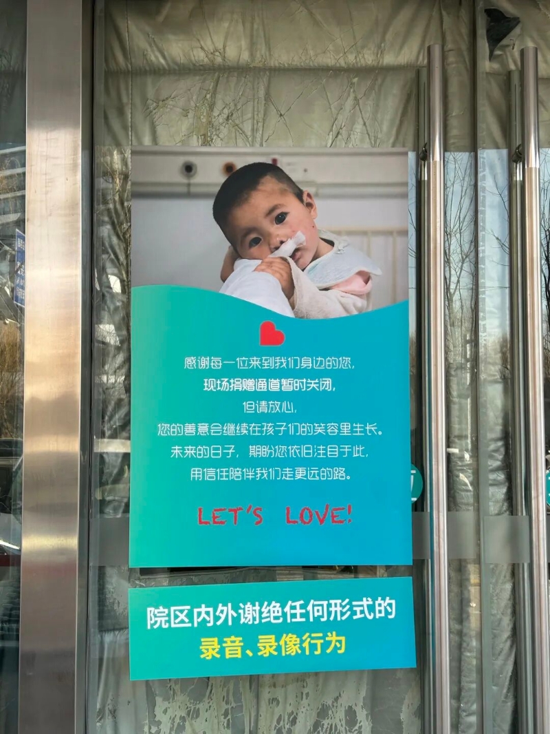 记者注意到,在医院门诊大楼门口,新贴了提示海报。提示称:感谢每一位来到我们身边的您,现场捐赠通道暂时关闭。但请放心,您的善意会继续在孩子们的笑容里生长。