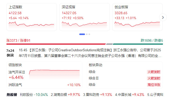 1月22日消息,市场早盘冲高回落,午后震荡走强,创指涨近1%。截至收盘,沪指报4122.58点,涨0.14%;深证成指报14327.05点,涨0.50%;创指报3328.65点,涨1.01%。