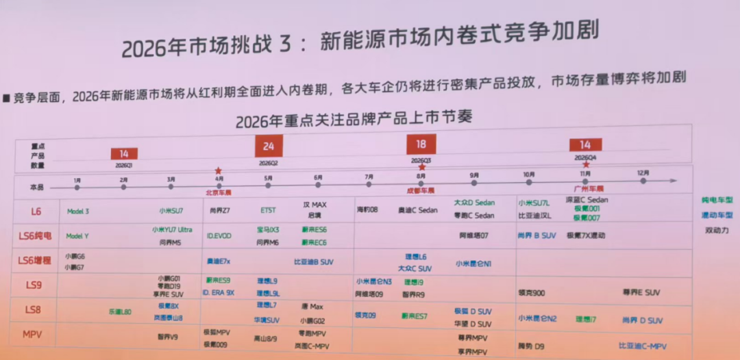 该材料还提到,2026年新能源市场将从红利期全面进入内卷期,各大车企仍将进行密集产品投放,市场存量博弈将加剧。