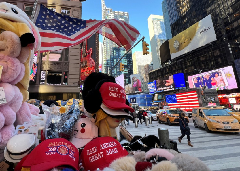 ▲纽约时代广场的纪念品摊位上摆放着“让美国再次伟大”的帽子。路透社