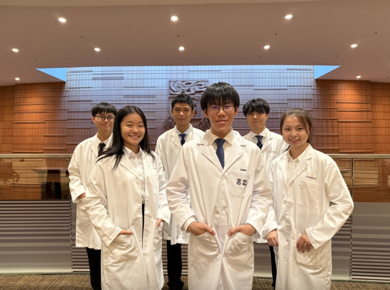 ▲去年共6名毕业生攻读医科,其中1名入读香港大学,其余5名入读中文大学,包括黄芸伊(前排右一),及考获4科5**的黄亦萱(前排左一)。(相片由受访者提供)