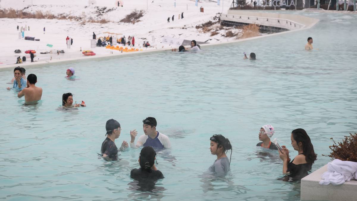 ▲全国年轻族群兴起洗浴泡温泉,消闲减压。图为渖阳一户外温泉。新华社