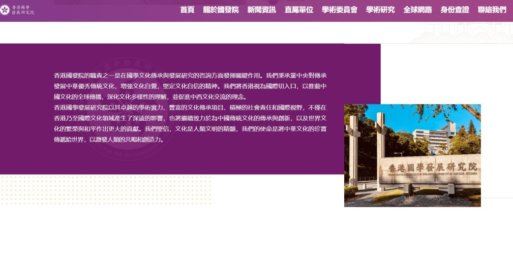 根据香港国学院官网,该机构是经特区政府批准的“综合性国学研究院”。网站刊登的学院院门图片竟刻意模仿中大校门建筑,试图营造权威感。据悉,香港中文大学正门的四根石柱是最为人熟悉的地标之一,俗称“四条柱”,正式名称是“华表”。