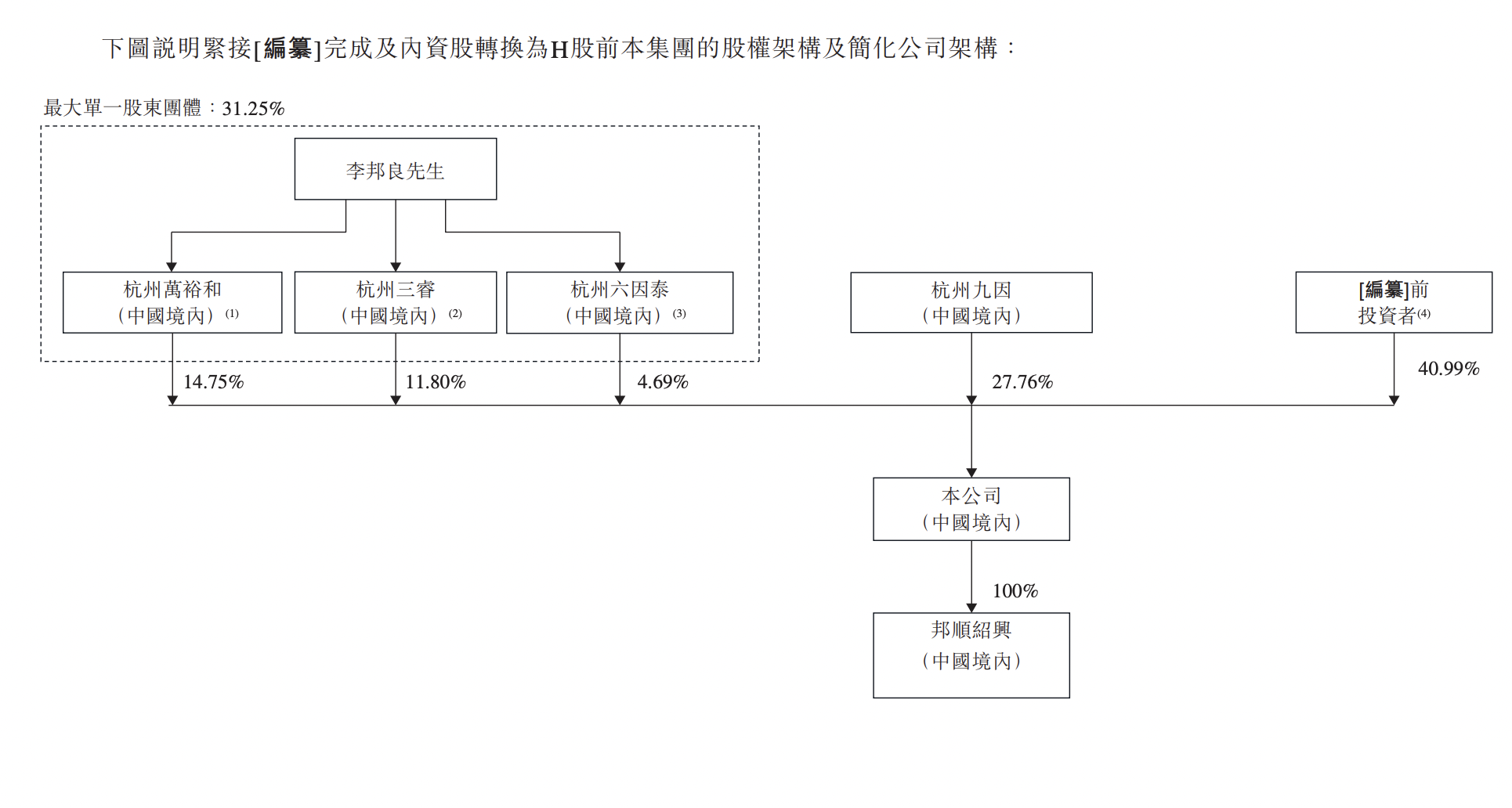 IPO前,董事长兼执行董事李邦良有权通过以下方式行使公司合共约31.25%的投票权:杭州万裕和(由李邦良控制及拥有99%权益)直接持有的750万股股份(占公司投票权约14.75%);杭州三睿(由李邦良作为其普通合伙人控制)直接持有的600万股股份(占公司投票权约11.80%);及杭州六因泰(由李邦良作为其普通合伙人控制)直接持有的238.5万股股份(占公司投票权约4.69%)。李邦良、杭州万裕和、杭州三睿及杭州六因泰被视为一组控股股东。
