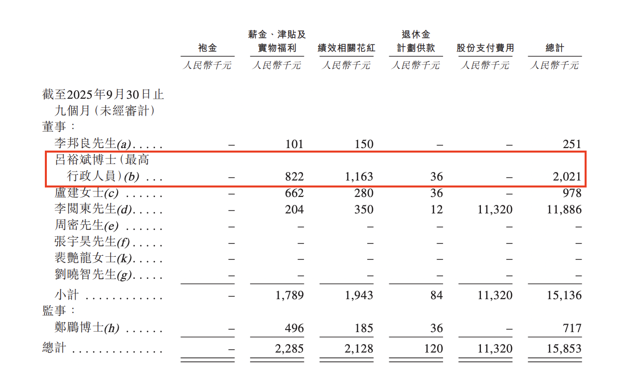 薪酬方面,2024年、2025年前9月,吕裕斌薪酬总计分别为334.7万元、202.1万元。