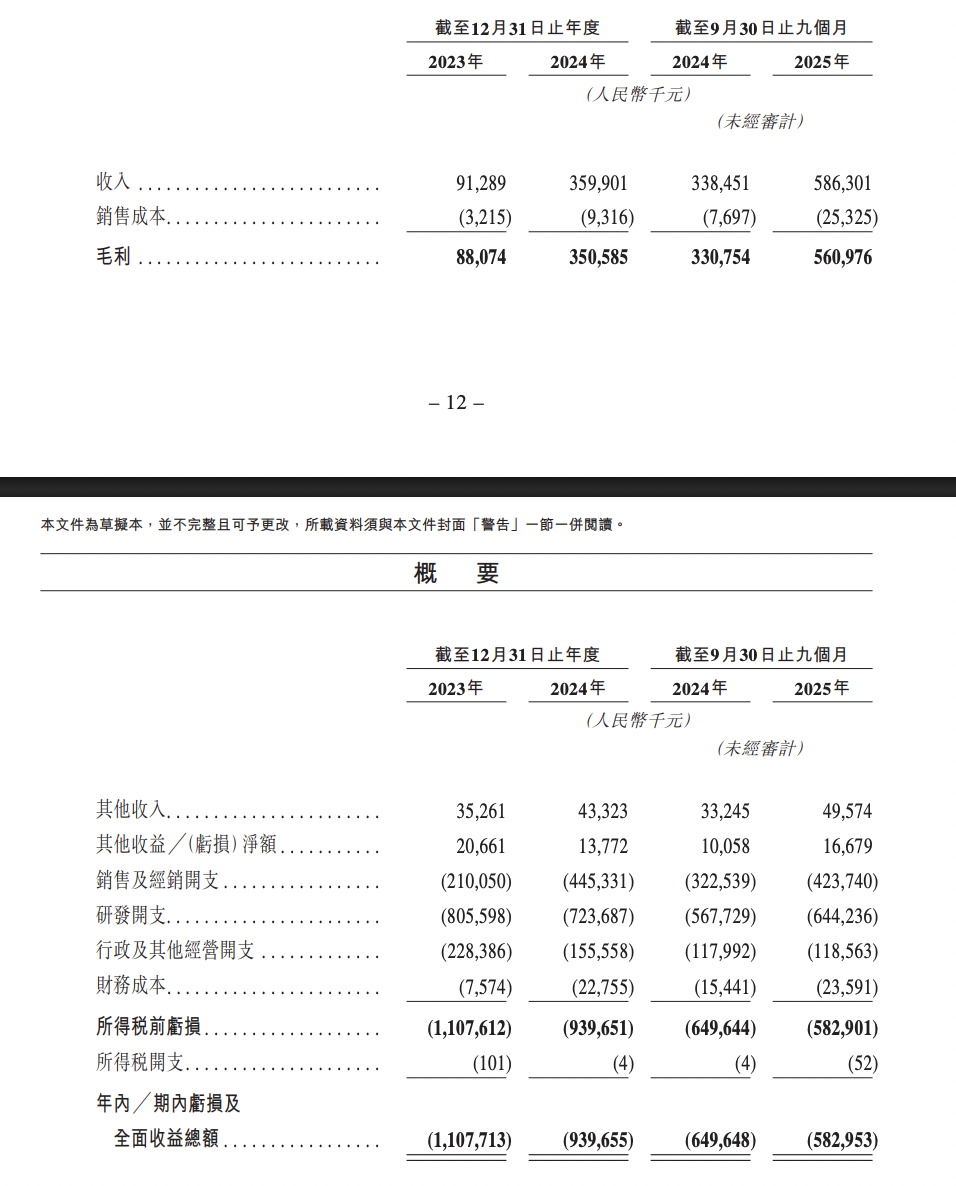2023年、2024年及2025年前9月,迪哲医药收入分别为9128.9万元、3.6亿元、5.86亿元,年内╱期内亏损及全面收益总额分别为11.08亿元、9.4亿元、5.83亿元,毛利率分别为96.5%、97.4%及95.7%。