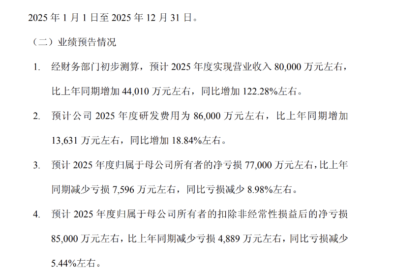 1月12日,迪哲医药公告,预计2025年度实现营业收入8亿元左右,同比增加122.28%左右;研发费用为8.6亿元左右,同比增加18.84%左右;归属于母公司所有者的净亏损7.7亿元左右,同比亏损减少8.98%左右。