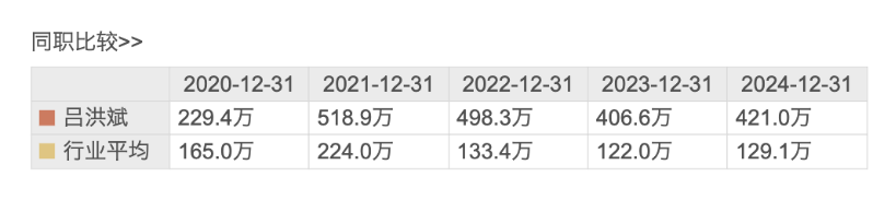 东方财富数据显示,2020年至2024年,吕洪斌薪酬分别为229.4万元、518.9万元、498.3万元、406.6万元、421万元。