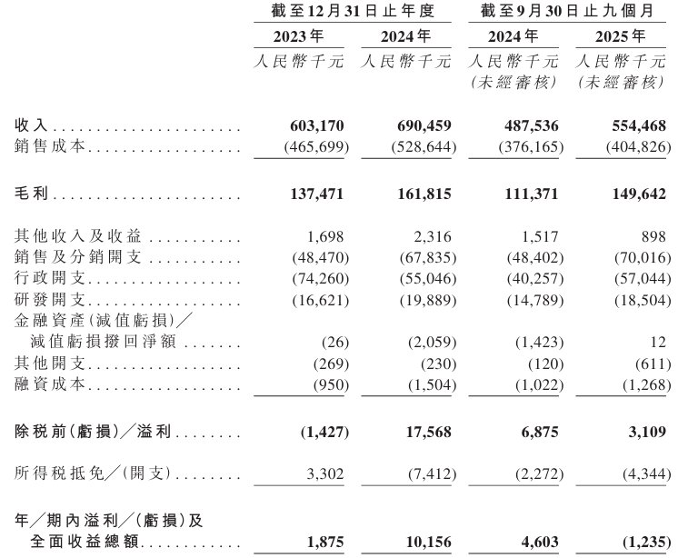 2023年、2024年及2025年截至9月30日止九个月,该公司年╱期内溢利及全面收益总额分别为187.5万元、1015.6万元、-123.5万元人民币。