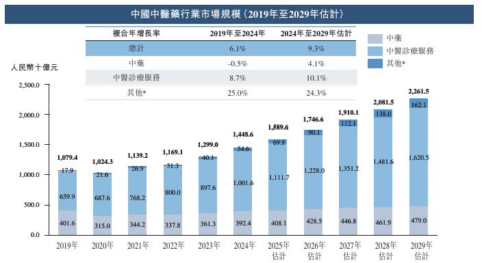 在整体中医药行业内,不同分部已展现出各异的增长轨迹。中药分部于2019年至2022年间因疫情相关的中断及药品定价波动而经历波动的复苏阶段,于2019年至2024年录得负0.5%的复合年增长率,并预计于2029年将达到市场规模人民币4,790亿元,即复合年增长率4.1%。相比之下,中医诊疗服务分部展现出更强劲的增长势头,于2024年达到约人民币10,016亿元,并预计将以10.1%的复合年增长率增长,于2029年达人民币16,205亿元。此外,其他分部随着中医药服务的数字化及服务便利性改善而扩张,由2019年的人民币179亿元增长至2029年的人民币1,621亿元。总体而言,虽然中医药行业规模持续扩大,但其增长伴随着持续的结构优化,行业逐渐由以药品为中心的模式向更综合的医疗及健康发展范式转型。