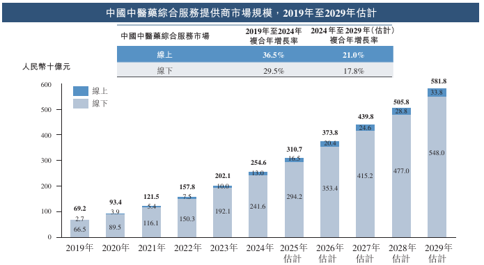 在有利政策、健康消费升级及技术整合的支持下,中国中医药综合服务市场已展现强劲的增长势头。虽然线下分部仍然规模庞大,但线上综合中医药服务市场已成为关键的增长引擎,由2019年的人民币27亿元扩大至2024年的人民币130亿元,复合年增长率为36.5%。