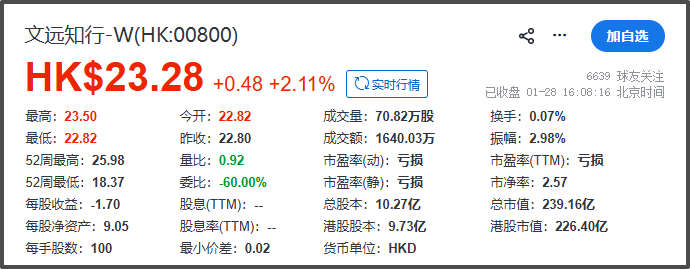 截至1月28日收盘,文远知行报23.28港元/股,上涨2.11%,总市值约240亿元。
