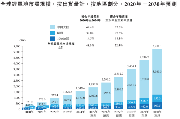 全球锂电池行业保持高速增长,已成为全球能源转型与新型工业体系的重要支撑。全球锂电池出货量由2020年的323.2GWh增长至2024年的1,549.6GWh,复合年增长率48.0%;预计到2030年,全球出货量将超过5,200GWh,自2024年起复合年增长率达22.5%。中国仍是全球最大市场,出货量由2020年的142.5GWh增长至2024年的1,173.0GWh,复合年增长率69.4%,预计到2030年将超过3,900GWh,维持自2024年起22.5%的复合年增长率。