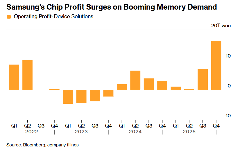美国三大存储产品领军者之一的HDD霸主希捷科技,以及韩国存储芯片巨头SK海力士公布无比强劲的业绩带动全球存储芯片/存储产品类股票集体狂欢之后,存储领域在今日可谓迎来“核爆级利好催化”。全球最大规模DRAM存储芯片供应商三星电子(Samsung Electronics Co.)公布的最新业绩数据显示,该科技巨头旗下的芯片业务以超过五倍的利润增幅超出几乎所有分析师预期,这无疑是史无前例的人工智能支出浪潮带动DRAM/NAND存储芯片需求持续激增的超级重磅信号。