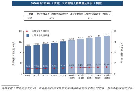 数据显示,2020年至2024年,私立医疗服务机构的付费患者就诊人数以8.1%的复合年增长率快速增长,预计到2029年将达到19.876亿人次;中国大众富裕人群数量至2024年已达1.231亿人,预计2029年将达1.447亿人,比例亦从8.7%增长至约10.3%。