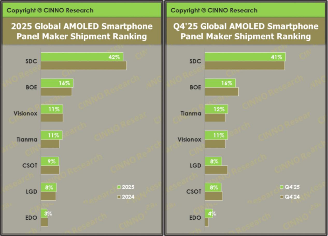 到厂商层面,三星显示(SDC)尽管仍以41.5%的份额位居全球第一,但其市场份额同比下滑了1.7个百分点,主力刚性产品需求萎缩及中低端柔性订单流失是主要原因。京东方(BOE)以出货量同比增长9.0%、市场份额16.3%的表现稳居全球第二,其增长动力来源于中端市场的规模化与折叠屏等高端市场的突破。维信诺(Visionox)以11.1%的份额位居全球第三。