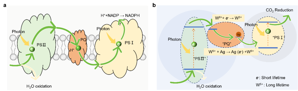 植物通过光合作用,巧妙地将结构简单的二氧化碳和水转化为复杂的养分分子,为人类借助化学手段实现温室气体二氧化碳的资源化利用提供了自然范例。然而,人工模拟光合作用的过程仍面临科学挑战,其关键瓶颈在于:光激发功能材料所产生的电子(用于还原二氧化碳)与空穴(用于氧化水)寿命极短,难以实现二者反应的同步与持续进行。