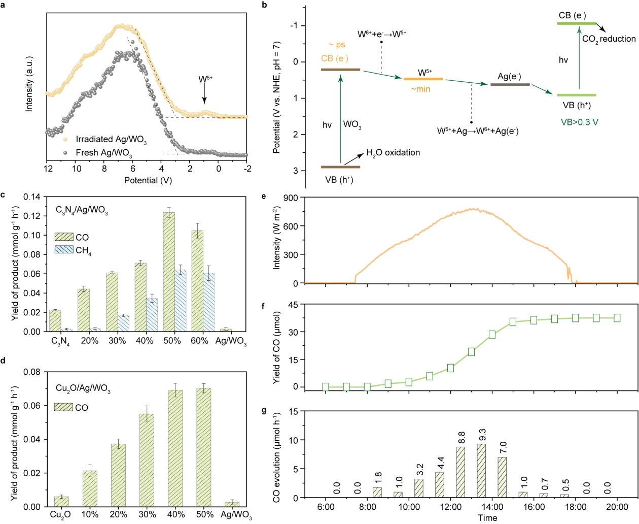 我国科研团队这项新方案模拟植物暂存光生电子的生理机制,创新性地设计出一种电子存储路径,通过定向设计、制备材料结构,使其能够在光照时储存电子,并在需要时精准释放,从而实现对二氧化碳与水反应速率和程度的精确调控。基于这一思路,研究团队成功构建出具有电子存储功能的银修饰三氧化钨(Ag/WO3)材料。通过将其与催化活性组分酞菁钴复合进行验证,测得二氧化碳转化效率较纯酞菁钴提升了近百倍。此外,这一策略具备良好的通用性与适用性,可根据实际需求构建多种结构适配的复合催化剂体系。该方案在自然光条件下运行稳定,为利用太阳能规模化转化二氧化碳、生产一氧化碳、甲烷等清洁能源提供了可行的技术路径。