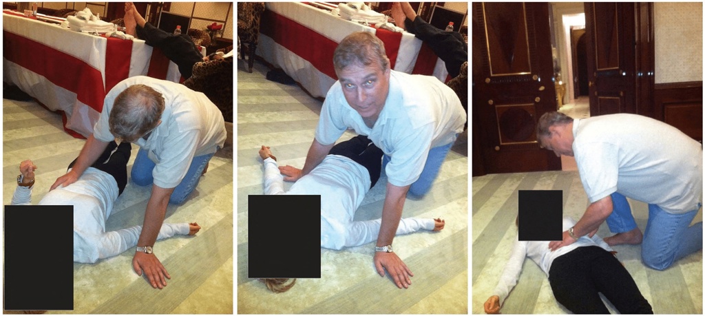 ▲美国司法部公开安德鲁旧照,画面中他俯身在一名女子身上,抚摸女子腹部。(图/路透社、美国司法部)