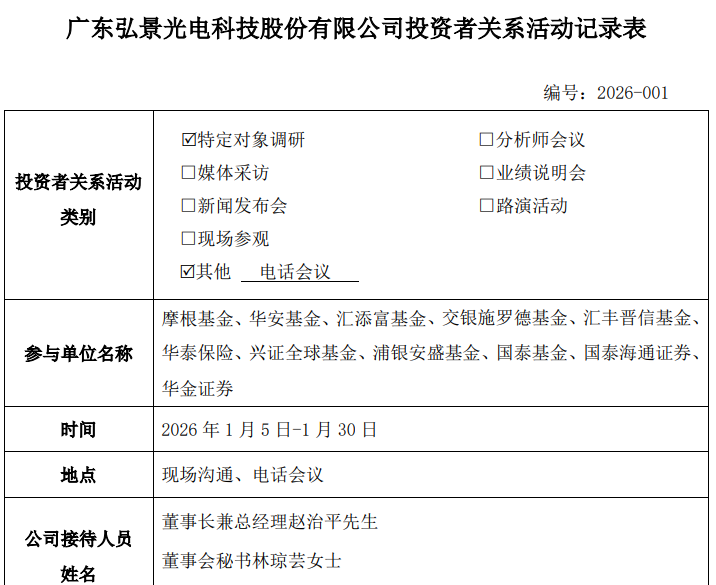 2月2日晚间,广东弘景光电科技股份有限公司(以下简称弘景光电,301479.SZ)披露2026年1月投资者关系活动记录表显示,当月一系列投资者调研活动中,公司董事长兼总经理赵志平、董秘林琼芸等向摩根、华安、汇添富、交银施罗德、汇丰晋信、兴证全球、浦银安盛、国泰等公募基金,华泰保险,国泰海通和华金等券商介绍其业务进展,并对2026年多项主营业务表达乐观展望。
