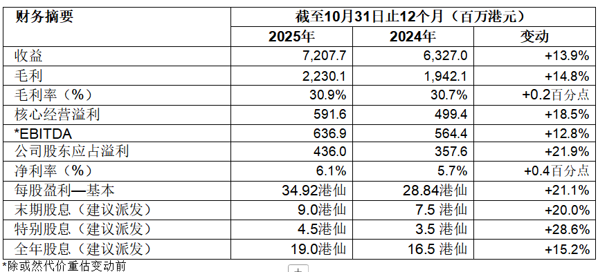 董事会建议派付末期股息(「末期股息」)每股普通股9.0港仙(二零二四年:末期股息7.5港仙)及特别股息(「特别股息」,连同末期股息统称为「股息」)每股普通股4.5港仙(二零二四年:特别股息3.5港仙)。连同中期股息每股普通股5.5港仙(二零二四年:5.5港仙),截至二零二五年十月三十一日止年度,股息合共为每股普通股19.0港仙(二零二四年:16.5港仙)。