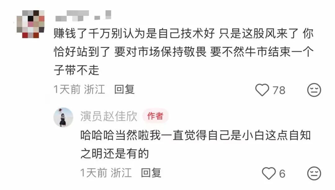 近日,演员赵佳欣在社交平台分享自己的基金投资经历,引发网友关注。她先是晒出收益,称自己买基金一个月盈利超5万元,还被朋友调侃是“被演戏耽误的金融家”。
