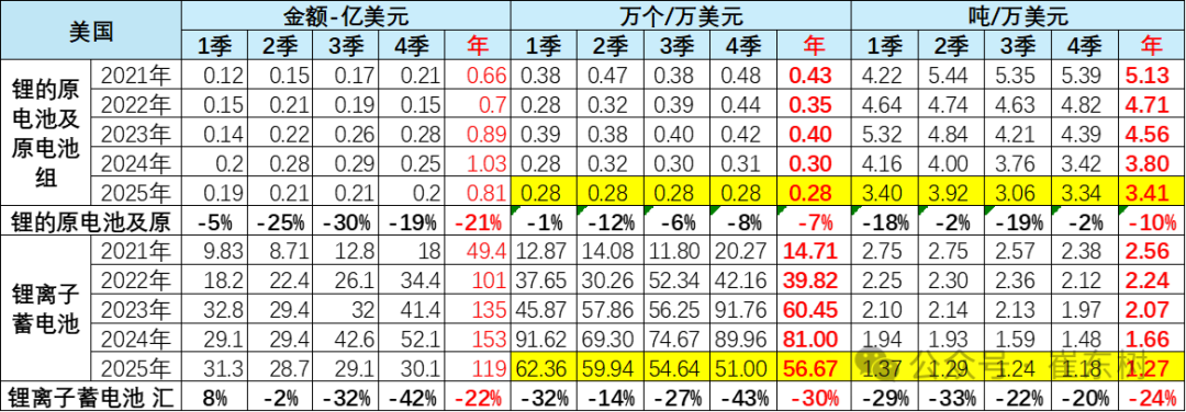 主要看锂离子蓄电池。2025年中国大陆对美国锂离子电池出口总体大幅下滑,从去年的153亿美元,下降到今年的119亿美元,金额下降22%,而且出口单价也下降24%。这体现了美国的AI带来的电力和储能的暴增,目前尚未与中国出口的锂电池相关。