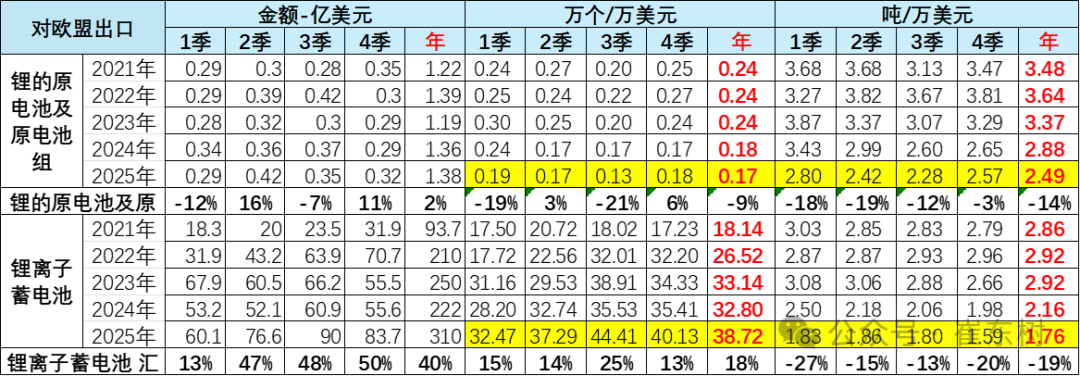 欧盟是中国锂电池最大出口市场,需求占比稳定在全球出口的40%左右,2025年占比较2024年提升4个百分点,市场地位持续巩固。2025年四季度对欧盟出口额达84亿美元,同比增长50%,成为拉动出口增长的关键力量。中国对欧盟锂的原电池出口较少。中国对欧盟出口的锂电池增长较快,从2024年 222亿美元上升到今年的310亿美元,增40%。中国对欧盟的出口弥补了对美国锂电池出口的下降,但出口单价下降20%的幅度较大。