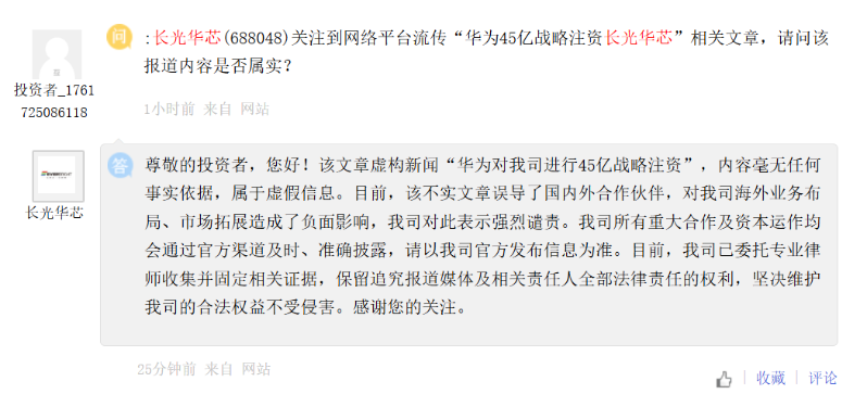 2月4日,有投资者在上证e互动平台向长光华芯提问,网传“华为45亿战略注资长光华芯”的消息是否属实?