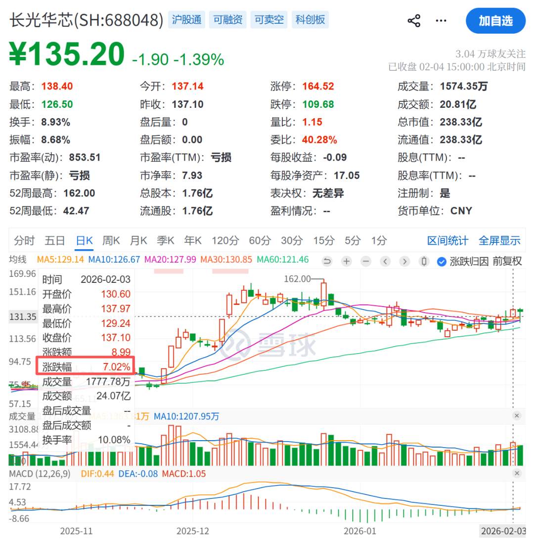 2月3日,长光华芯高开高走,当日收于137.1元/股,涨幅为7.02%。