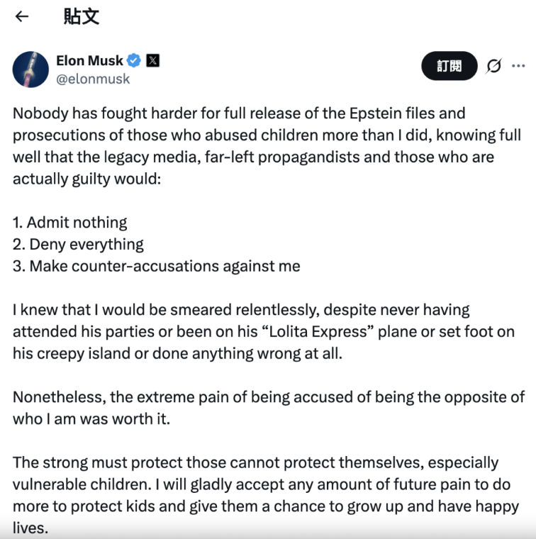 不过,马斯克于周一(2日)强硬回应,指自己一直支持全面公开爱泼斯坦档案,并追究涉及虐待儿童的人士。他强调自己从未参加过爱泼斯坦的派对,亦从未踏足“萝莉岛”或乘坐对方的私人专机。他批评传统媒体与“极左宣传者”因他支持公开档案而对他进行“无情抹黑”,而自己并未做过任何错事。