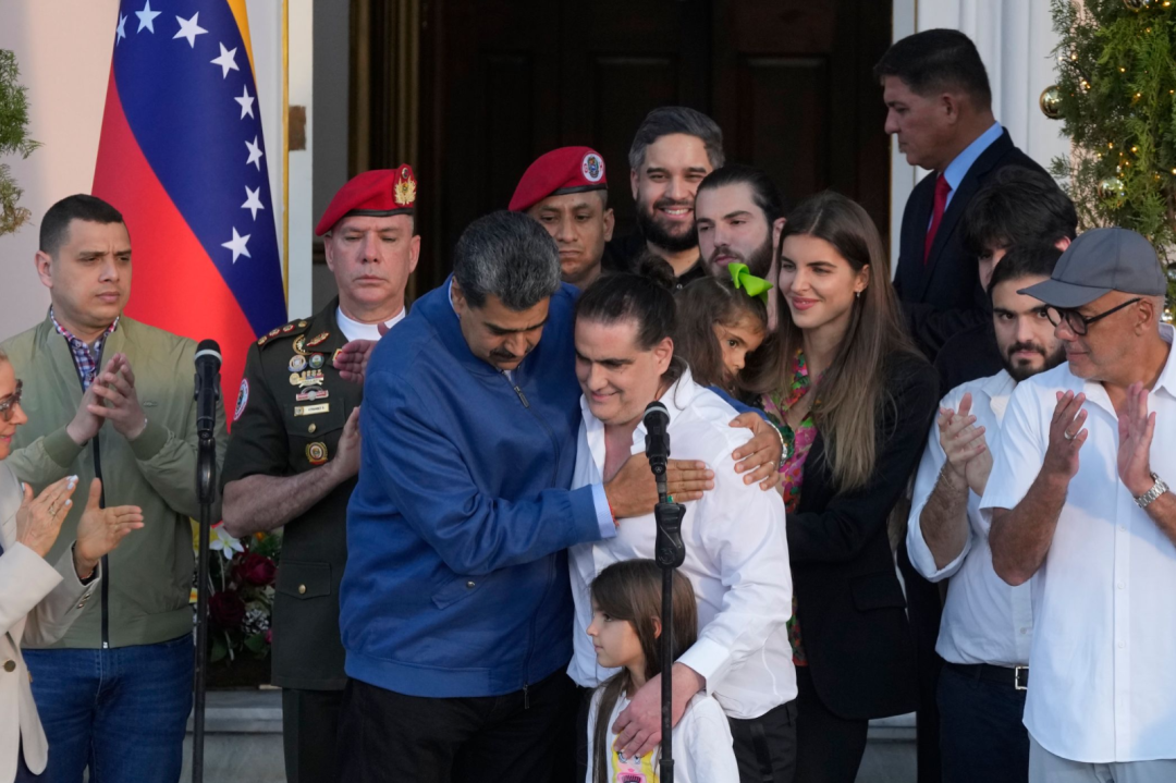 ▲2023年12月20日,委内瑞拉总统马杜罗(前左)与获释的亚历克斯·萨博(前中)会见媒体图片来源:新华社