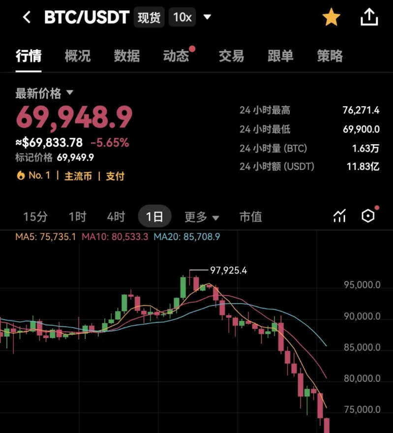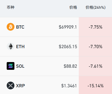 截至今日晚间发稿,比特币自2024年11月6日以来首次跌破70000美元关口。近24小时跌幅近7.8%,以太坊、SOL、XRP等主要币种均大幅下跌。Coinglass数据显示,近24小时加密货币市场共20.5万人被爆仓。