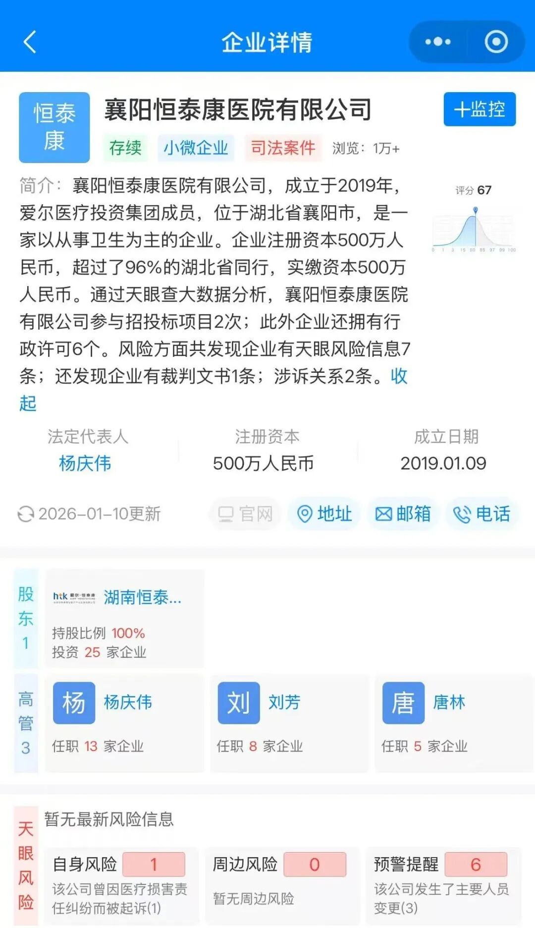 天眼查显示,报道中提到的襄阳恒泰康医院有限公司为爱尔医疗投资集团成员之一。