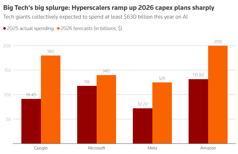 谷歌母公司Alphabet周三表示,预计2026年支出将在1750亿美元至1850亿美元之间,而Meta(META.US)表示,其资本支出可能比去年翻一番,达到 1150 亿美元至 1350 亿美元。