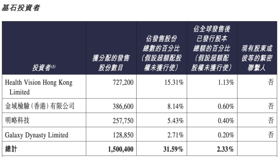 但卓正医疗此番IPO发行的股份总数仅475万股,相较港交所过往上市企业偏低,因此最终募资规模亦较小,不足3亿港元,其中基石投资者认购了约150万股发行股份,占比31.59%。