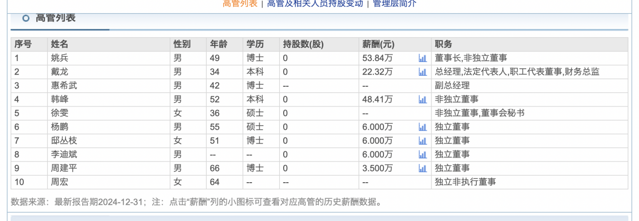 瑞财社注意到,2024年,戴龙薪酬为22.32万元。而董事长姚兵薪酬为53.84万元。