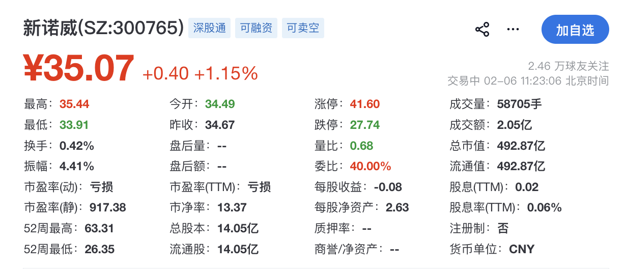 2025年12月,新诺威正式向港交所递交IPO招股书,拟冲刺A+H。截至2026年2月6日发稿时,新诺威A股每股报35.07元,总市值492.87亿元。