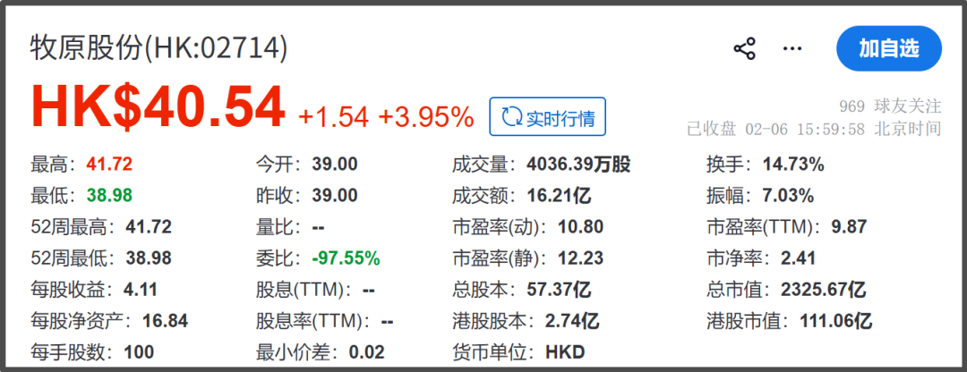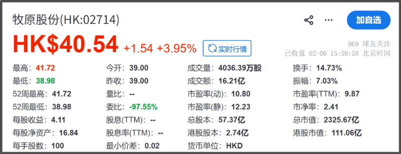 在较大幅度折价的情况下,牧原股份也降低了破发风险,利弗莫尔证券暗盘上涨5.13%,每股报价41港元。挂牌当天,该公司开盘价每股39港元,随后破发但迅速回升,截至2月6日收盘,牧原股份涨3.95%,报每股40.54港元,总市值2325.67亿港元。