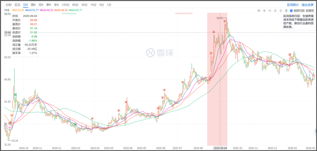实际上,2025年牧原股份的股价表现已优于行业水平,全年涨幅超过30%,主要受益于生猪出栏量增长和成本控制能力提升。其中,去年9月15日该公司股价一度触及每股58.65元,创近三年新高。