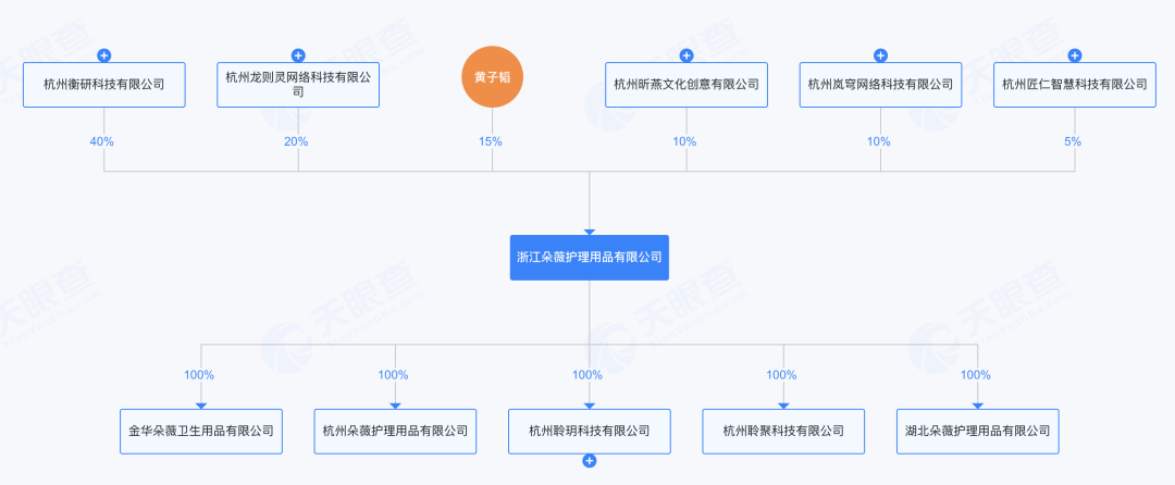 浙江朵薇护理是朵薇的核心生产工厂。该公司的股东信息显示,黄子韬直接持股15%,间接持股比例4.312%。其他两大股东分别是杭州衡研科技有限公司和杭州龙则灵网络科技有限公司,两家公司分别持股40%和20%。