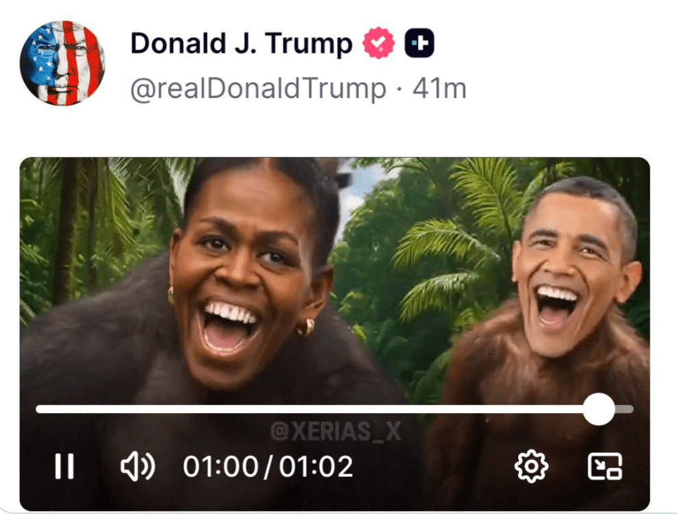 该段62秒的影片主要内容为指控2020年大选投票机存在舞弊,但在影片结尾约60秒处,竟出现两只灵长类动物,脸部则被合成奥巴马夫妇的笑容。由于历史上将黑人与猿猴联系被视为极其严重的种族主义隐喻,贴文一出,立即遭到民权领袖及多名政界重量级人物口诛笔伐。