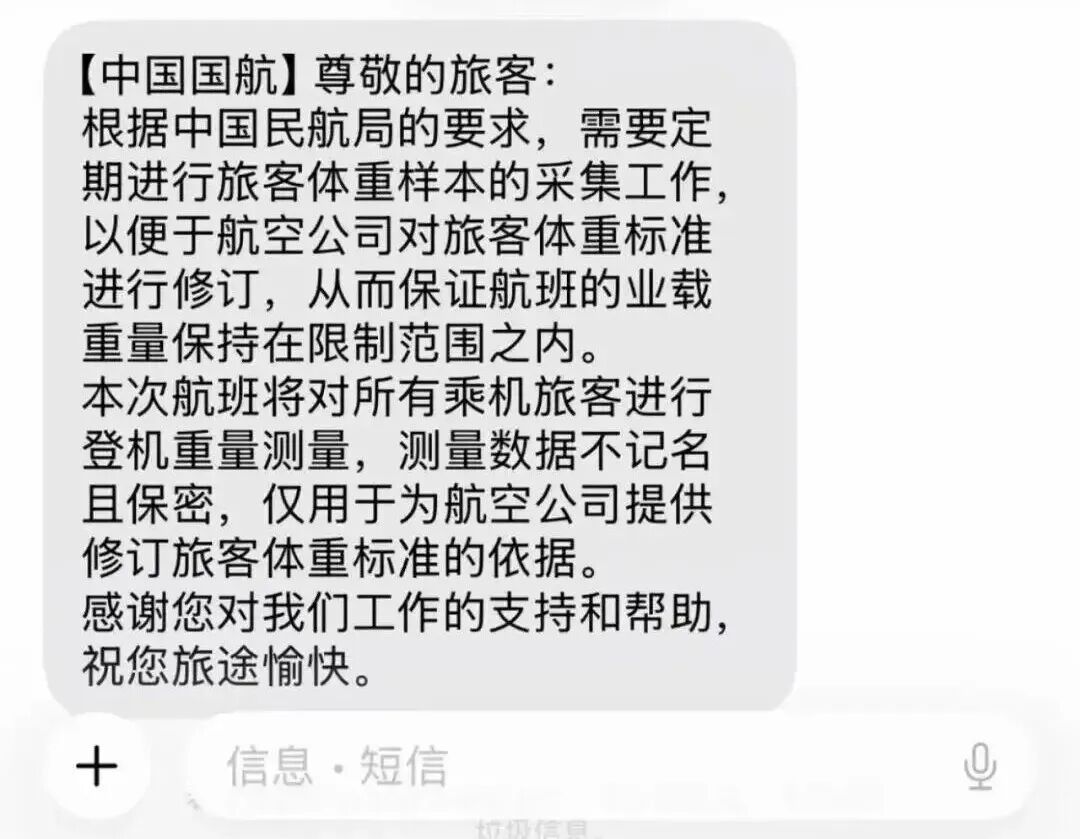 网友提供的航司短信称,据中国民航局要求,需定期进行旅客体重样本的采集工作,以便于航司对旅客体重标准进行修订,“本次航班将对所有乘机旅客进行登机重量测量,测量数据不记名且保密,仅用于为航空公司提供修订旅客体重标准的依据。”