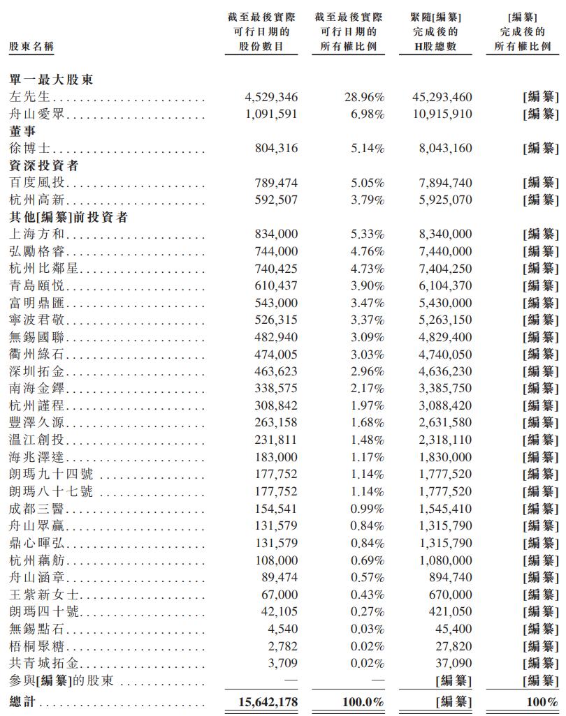 公司股份由左先生持有28.96%,由舟山爱众持有6.98%。舟山爱众为公司员工持股平台,其普通合伙人为左先生,故舟山爱众由左玉星先生控制。故此,截至最后实际可行日期,左先生直接及通过舟山爱众控制公司已发行股本总额约35.94%。