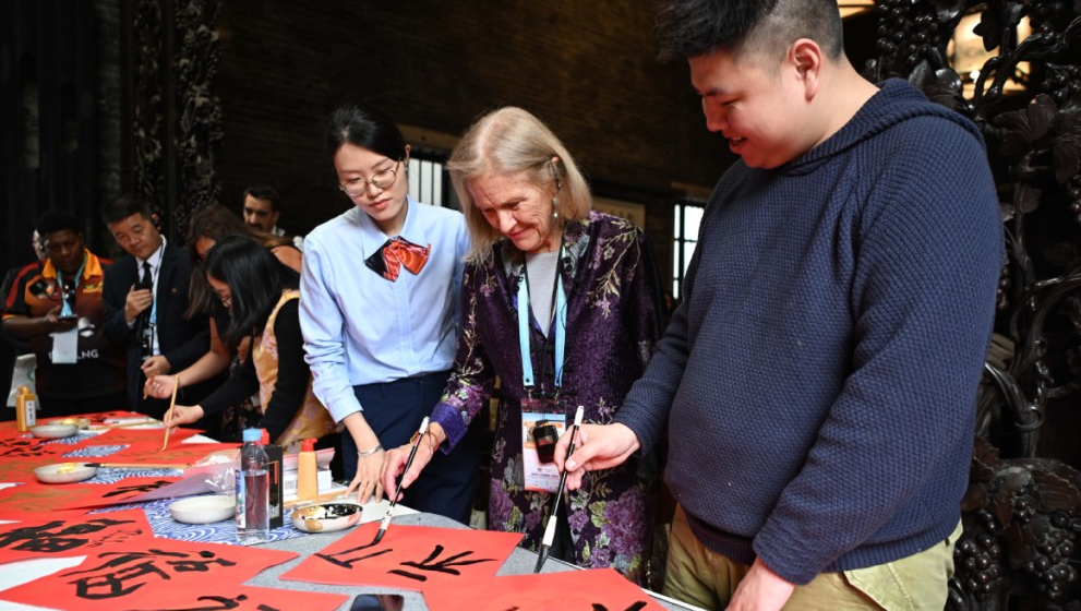 ▲2月6日,亚太经济合作组织(APEC)2026年第一次高官会的代表在广州体验中国书法。新华社